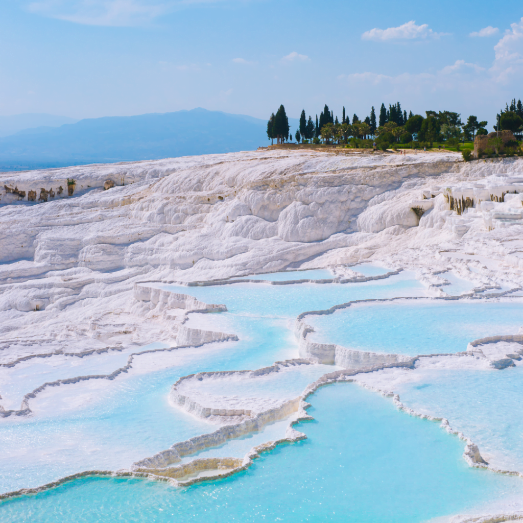 2.เมืองปามุคคาเล (Pamukkale) เมืองที่มีน้ำพุเกลือแร่ร้อนไหลทะลุขึ้นมาจากใต้ดินผ่านซากปรักหักพังของเมืองเก่าแก่สมัยกรีกก่อนไหลสู่หน้าผา จนเกิดผลึกกึ่งสถาปัตยกรรมสีขาวขึ้น