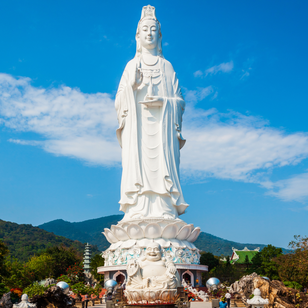 เจ้าแม่กวนอิม ณ วันหลิงอิ๋ง เป็นวัดที่ใหญ่ ที่สุดในดานัง รูปปั้นปูนขาวของเจ้าแม่กวนอิม หันหลังให้ภูเขา หันหน้าออกสู่ทะเล
