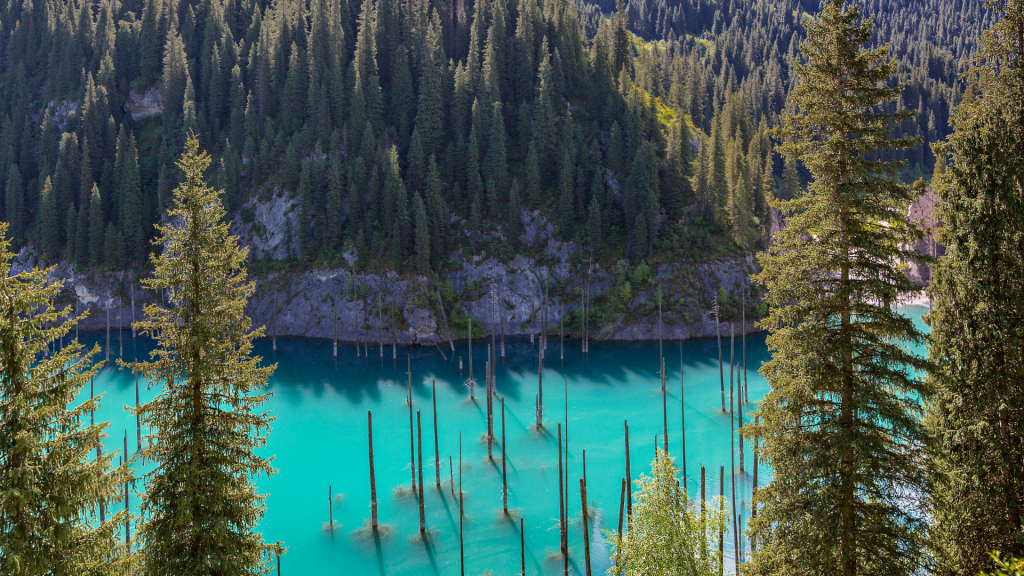 1. ทะเลสาบเคนดี้ (Kaindy Lake) – ป่ามนตราใต้บาดาล